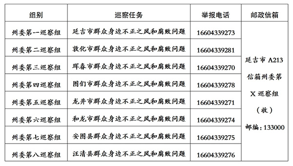 根据省委巡视工作统一部署,延边州委派出8个巡察组,对各县(市)开展第二轮群众身边不正之风和腐败问题专项交叉巡察“回头看”,主要受理各县(市)群众身边不正之风和腐败问题方面的举报和反映,重点涉及农村集体“三资”管理、养老服务领域、拖欠农民工环卫工人工资、回迁房安置的突出问题。其他不属于巡察受理范围的问题反映,将按规定转有关部门处理。巡察时间为2025年10月17日至11月17日,每日接听来电时间为8:30-17:00,巡察受理信访时间截至2025年11月10日。