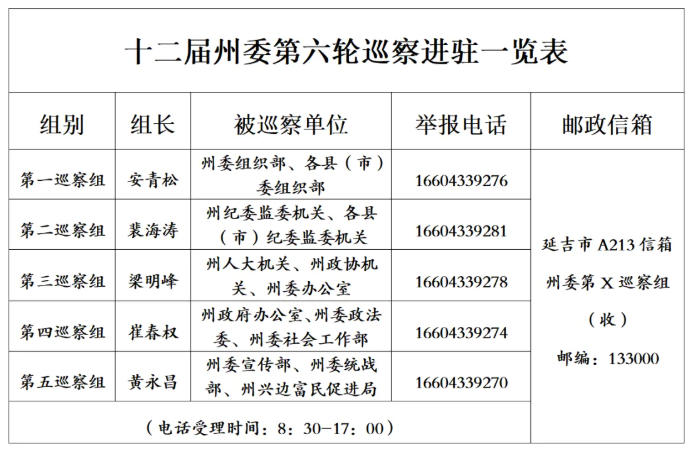巡察期间,各州委巡察组设立专门举报电话和邮政信箱,主要受理反映被巡察单位领导班子及其成员、下一级党组织主要负责人和重点岗位人员问题的来电、来信、来访,重点是关于违反政治纪律、组织纪律、廉洁纪律、群众纪律、工作纪律、生活纪律等方面的举报和反映。受理信访时间截止到2026年5月8日。